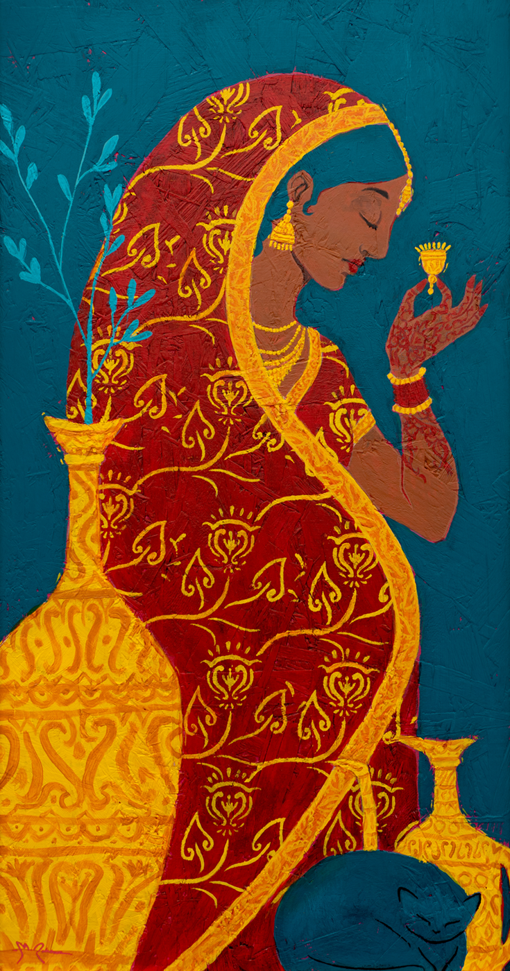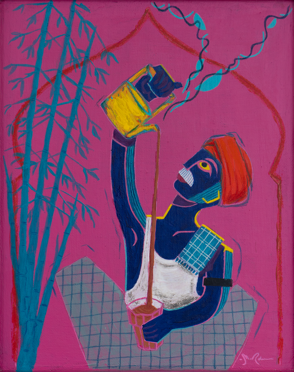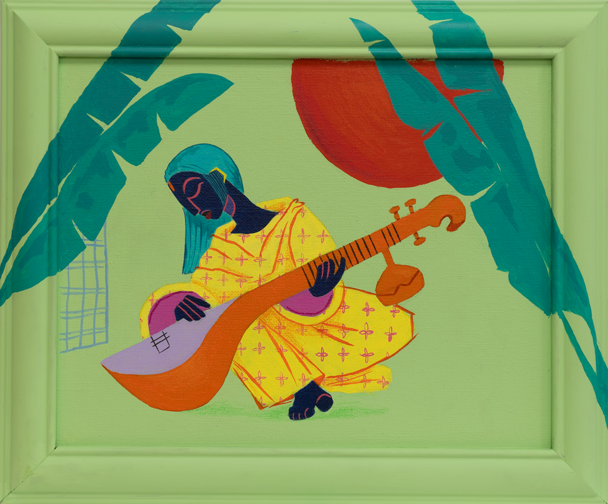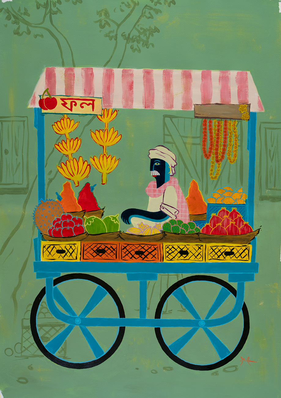 This collection comprises contemporary figurative images, drawing inspiration from the artists South Asian heritage, depicting familiar scenes using bold shapes, patterns and vibrant colours.