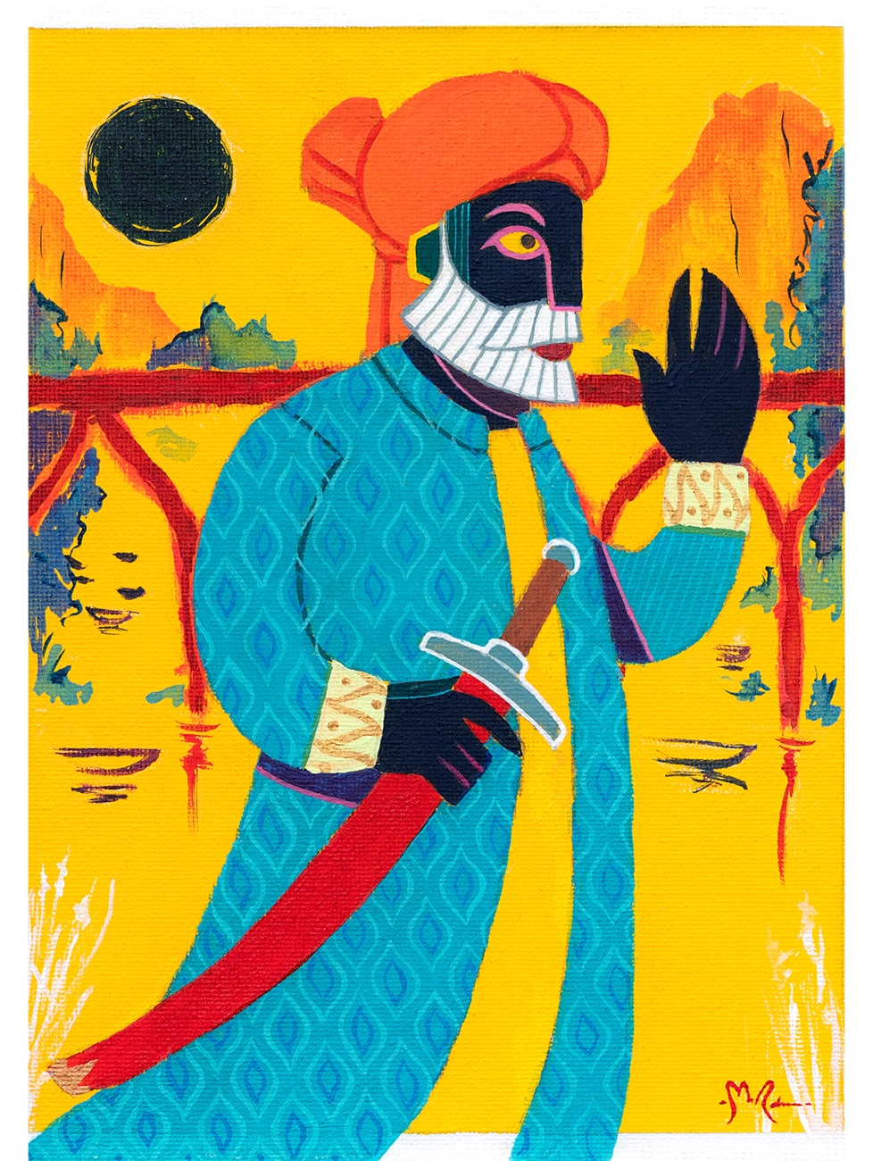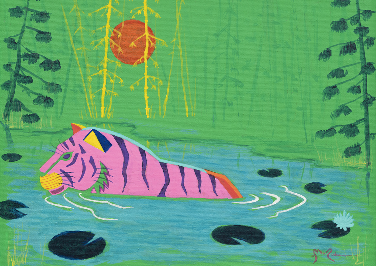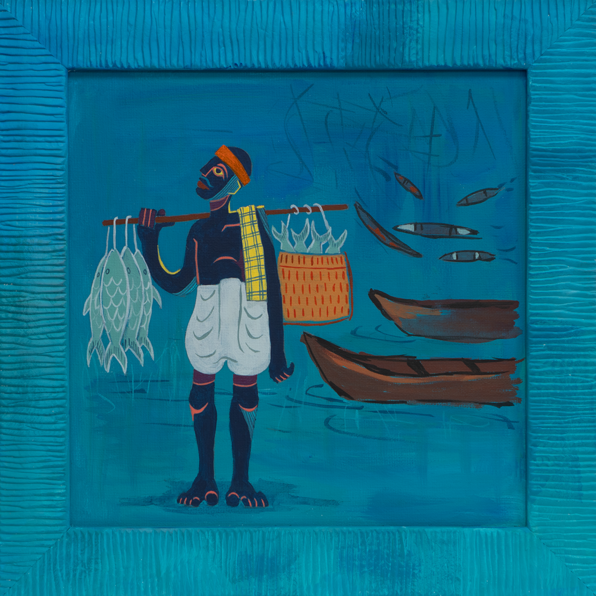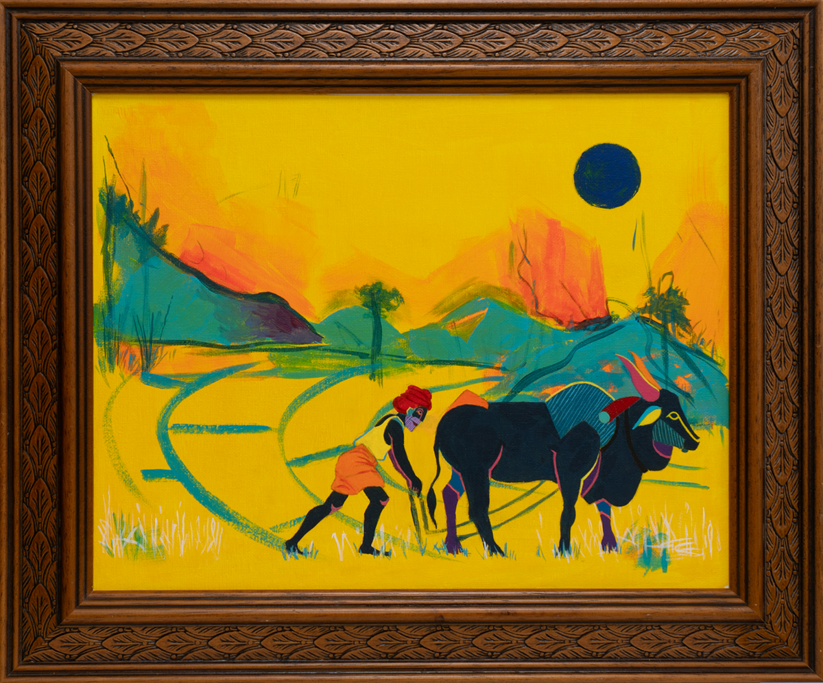 This collection comprises contemporary figurative images, drawing inspiration from the artists South Asian heritage, depicting familiar scenes using bold shapes, patterns and vibrant colours.